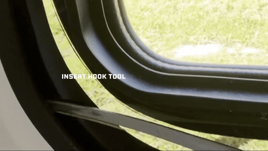 Insert the Hook Tool: Start at the bottom right corner of the window and push the straight hook tool through the adhesive with the braided wire threaded on the end.
