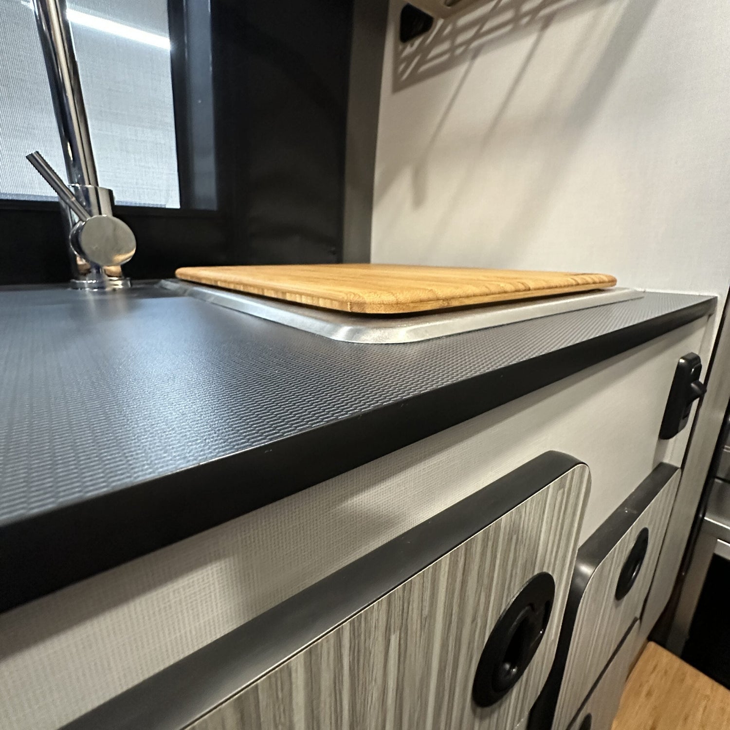 Our bamboo sink cover cutting board offers another cutting board that stows nicely inside the Winnebago Revel, Jayco Terrain, Entegra Launch and Tiffin GH1 sink without stowing it while traveling.
