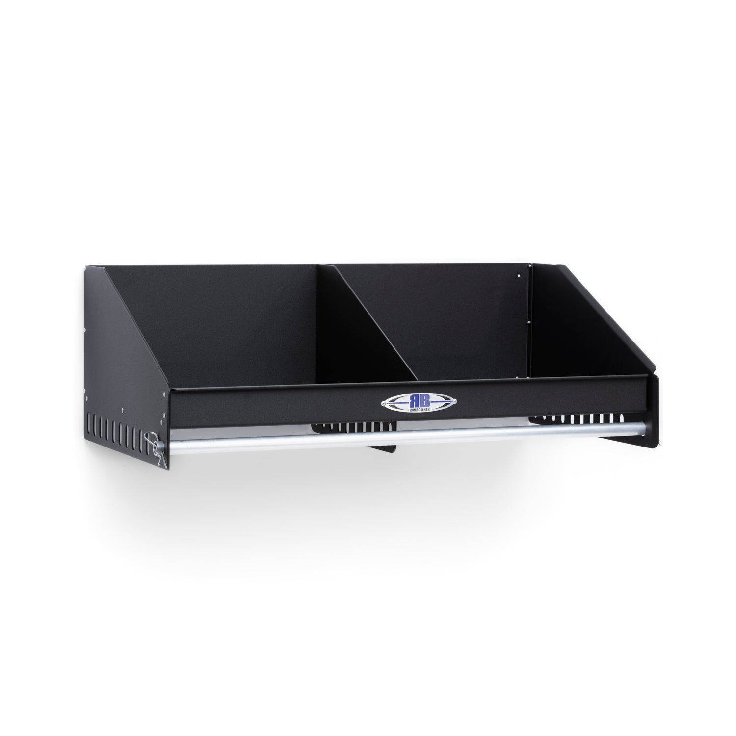RB Components has extended our line of helmet bays by offering a double helmet bay. Prevent unwanted nicks to your helmets and hang multiple items. Made from durable powder-coated aluminum, this storage shelf will stand up to years of abuse. No other manufacturer combines helmet storage, removable goggle bar and closet packed into one. This storage shelf mounts easily into your trailer, shop or garage wall. Shelf comes completely assembled and ready for use. Pictured helmet, goggles, shirt and plastic hanger are not included. Proudly Made in the U.S.A.