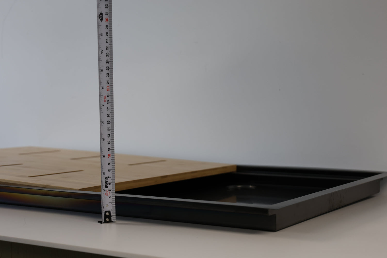 Flush-Mount Design: The low-profile shower pan can be inset into your floor, and when paired with the bamboo cover, it transforms into completely walkable, usable floor space—a vital resource in van life.