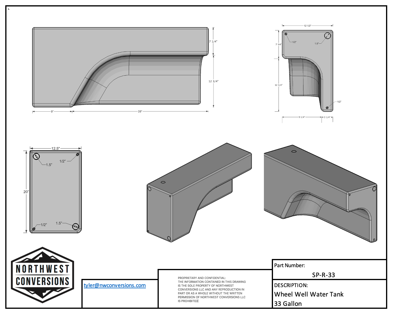 Specifications: Northwest Conversions 33 Gallon 1997+ Sprinter Wheel Well Water Tank - Right (SP-R-33)