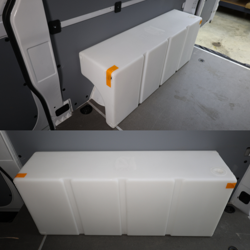 The Northwest Conversions 33 Gallon 1997+ Sprinter Wheel Well Water Tank - Right (SP-R-33) is designed to use the wasted space around the well. It is designed to fit the Sprinter 2500 and will also fit the Sprinter T1N and Transit single rear wheel vans. The tank can also fit other vehicle makes and models. Tank measurements are 48” long x 20” tall x 12.5” wide.