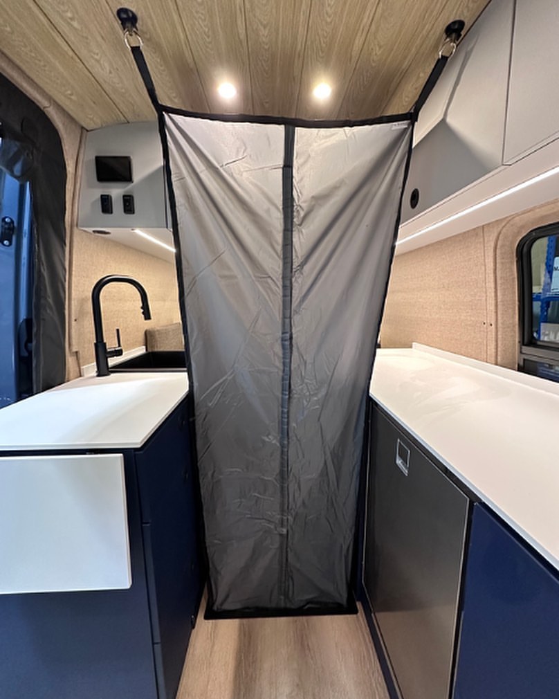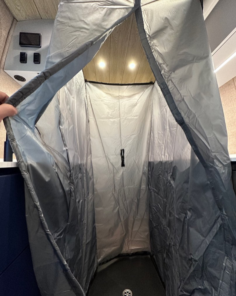 - (Optional) Tetravan Universal Shower Curtain - magnetic waterproof ripstop curtain, perfectly sized and designed to work with the Tetravan In-Floor Shower Pan (73" long)