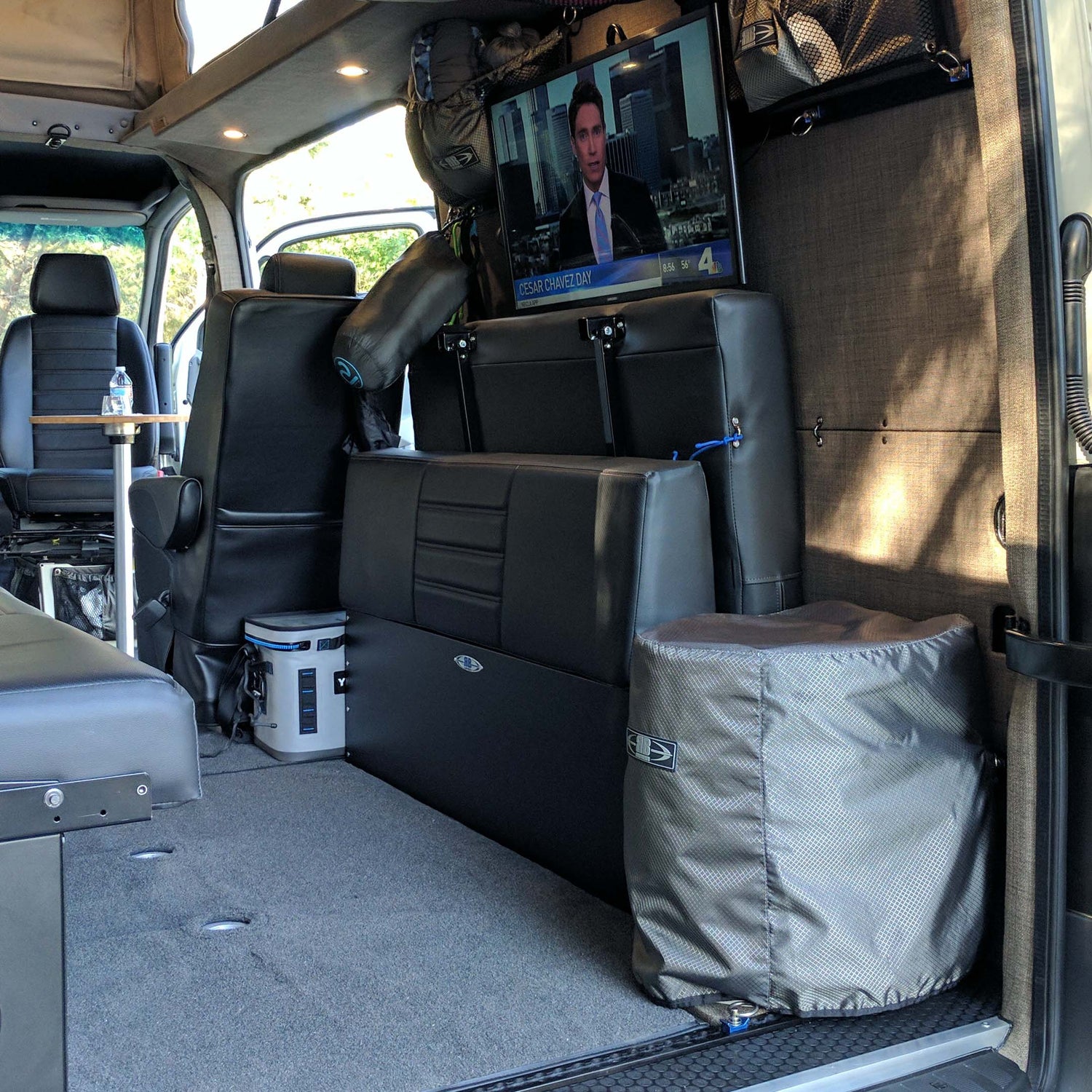 - Under-sofa storage boxes secure to the van floor and wall. Since the load from the furniture is being carried y the box, the wall attachment does not have to be as strong as under typical wall mounted furniture installation.
