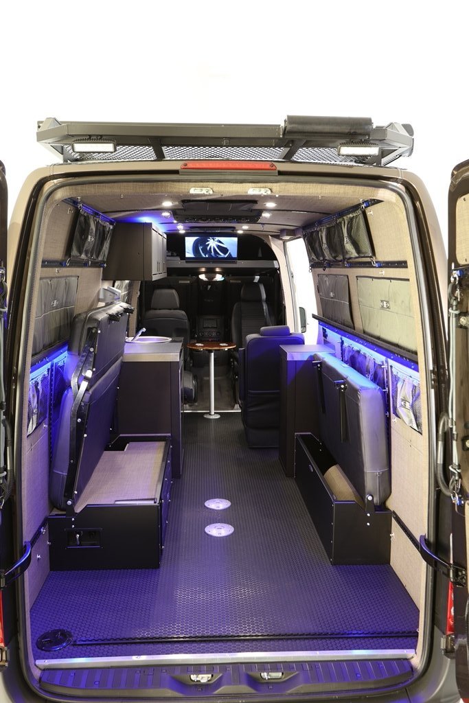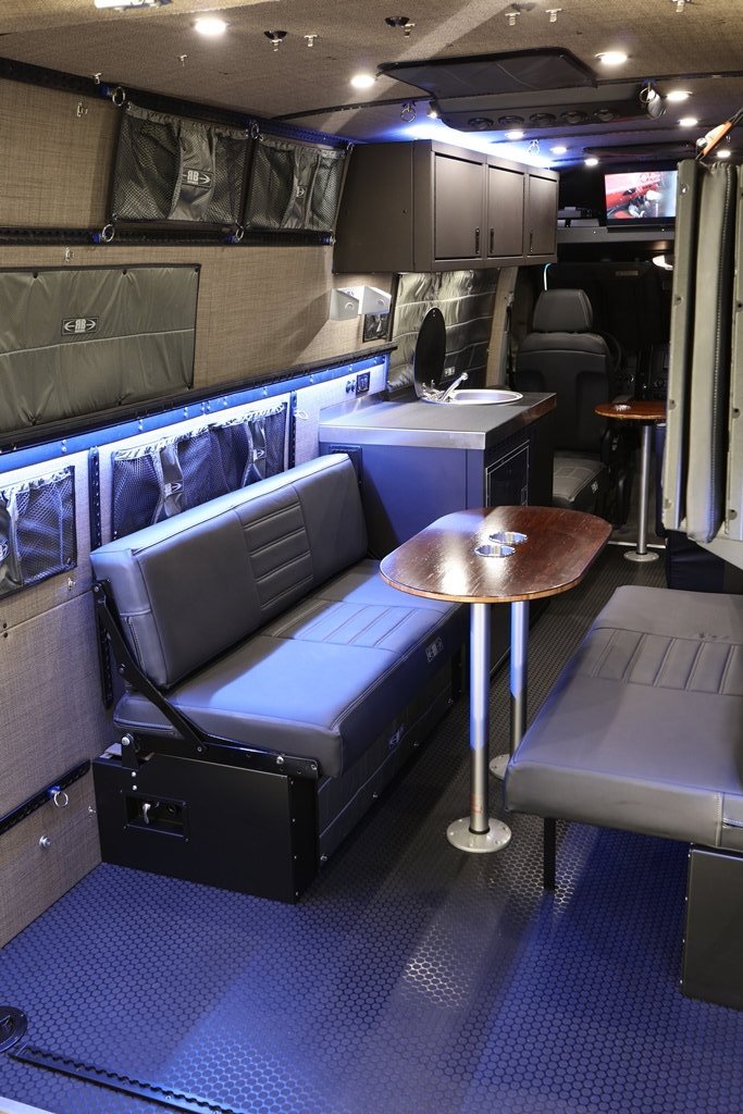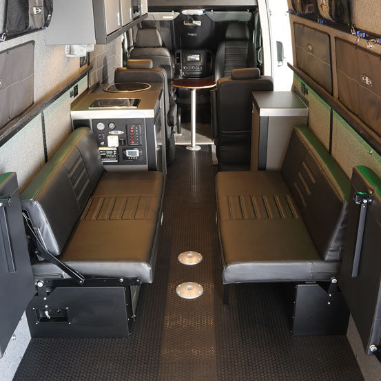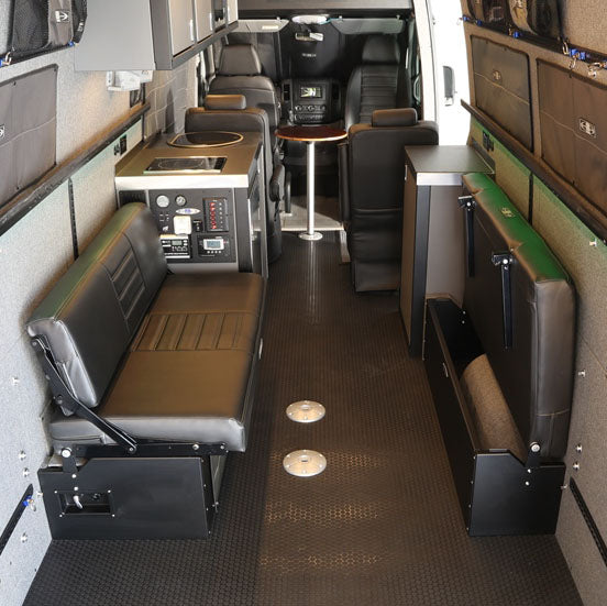 - Under-sofa storage boxes secure to the van floor and wall. Since the load from the furniture is being carried y the box, the wall attachment does not have to be as strong as under typical wall mounted furniture installation.