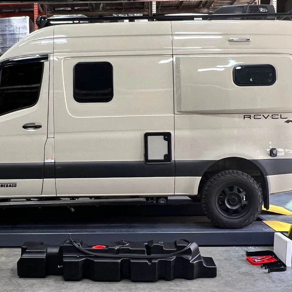 The S&B Tank for AWD vans fits 170" Crew, Sanctuary, Tranquility, Entegra Launch, Jayco Terrain, 2025+ Revels and any builds that have plumbing or interference behind the original fuel tank.