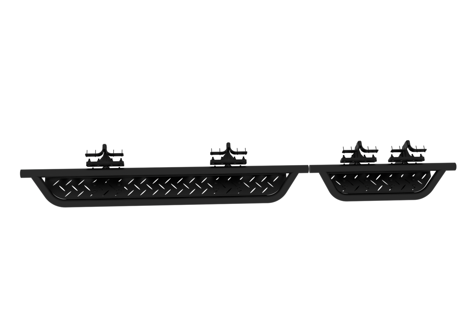 Constructed with coated aluminum, this drop-down running board system delivers long-term corrosion resistance and dependable strength. The modular three-piece layout includes dedicated driver, passenger, and sliding-door steps, allowing individual sections to be installed, adjusted, or replaced as needed. Each step is built around a 1.75" aluminum tube and a wide footbed to provide a stable platform when entering or exiting the vehicle.