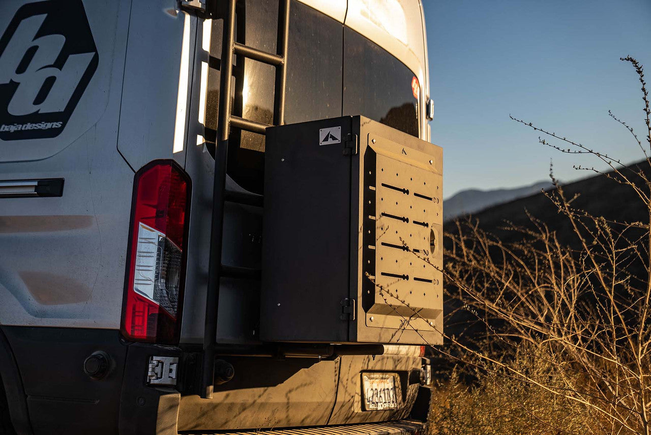 With the optional bolt-on tire/box carrier, you can move the spare tire out from under the van onto the rear door, improving your departure angle for high-clearance roads, or allowing extra space for fuel/water/black/gray tanks.