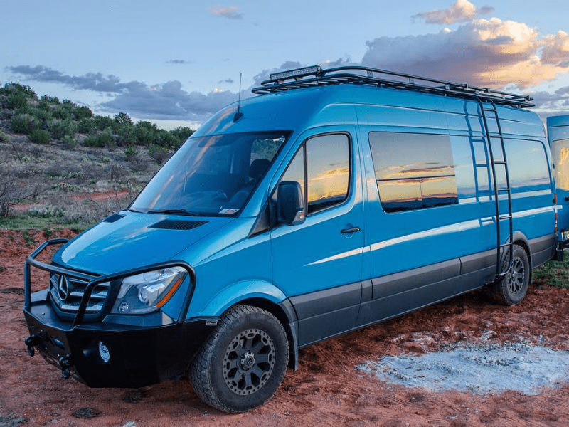 This custom Sprinter front bumper is winch-compatible, in case you want to mount a winch to get you out of any recovery situations. It can house most 9,000 pound winches without an integrated solenoid, and some compact 12,000 pound winches.