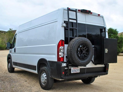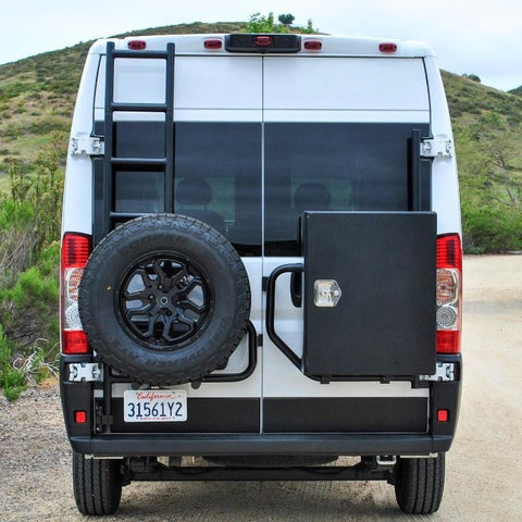 Choose Rear Door Ladder only, or upgrade to popular Ladder and Tire/Box Carrier with bolt-on tire/box carrier option. Moving the spare tire out from under the van onto the rear door, improving your departure angle for high-clearance roads, and allowing extra space for fuel/water/black/gray tanks.