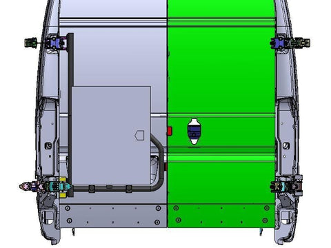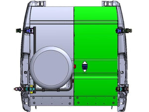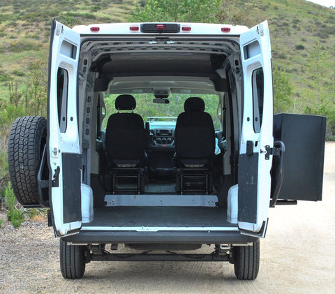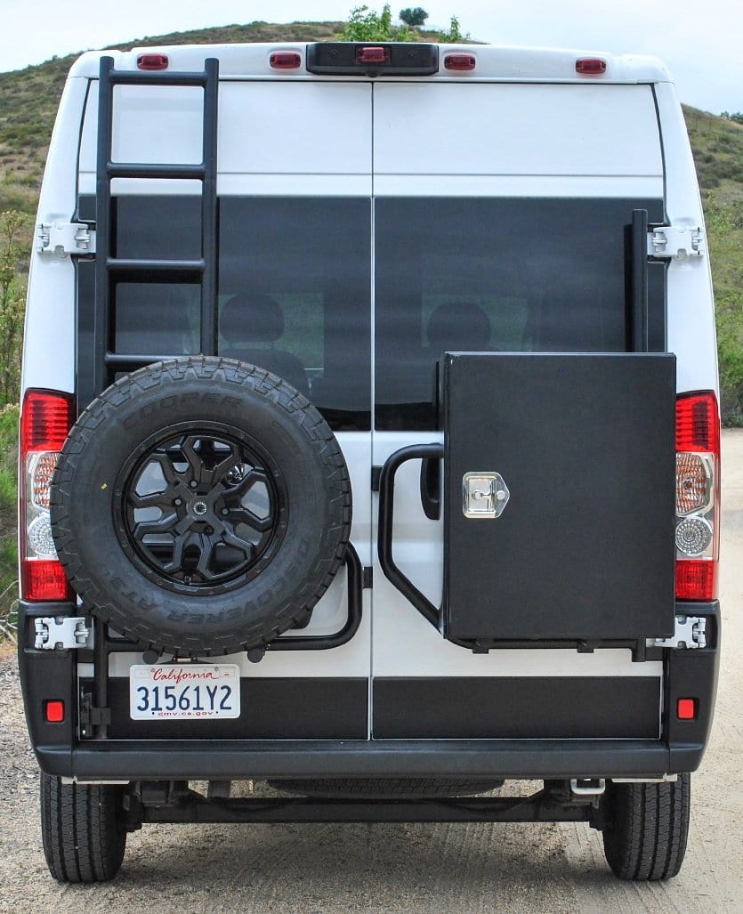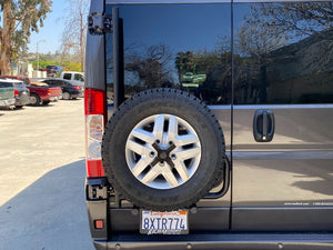 Whether you are looking for additional storage solutions or need to relocate your oversized tire, we solve this problem with the Aluminess Ram ProMaster Tire/Box Carrier. Not only can you carry your full-size spare, but you will have extra room under the van for auxiliary fuel and water tanks.
