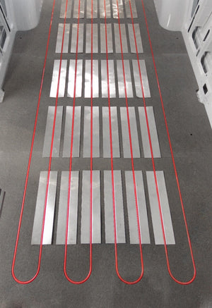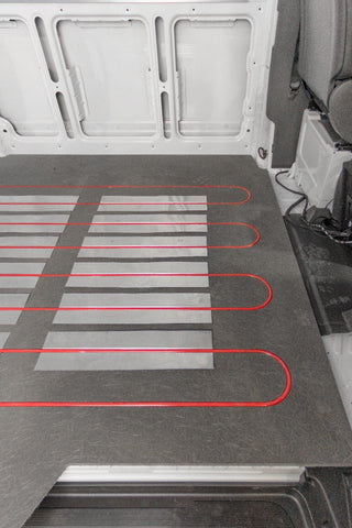 - Subfloor - A dense, rigid subfloor to hold the heat, cut exactly to fit your van model. The subfloor is built from a high-tech composite board made of extremely dense, highly-insulating polyurethane foam reinforced with fiberglass. The composite board is CNC-machined with precise grooves for the PEX tubing and the aluminum heat transfer plates, which retain and distribute the heat throughout the floor. The subfloor assembly is dimensionally stable, and finished with marine plywood to provide a smooth, strong substrate for finish flooring. The top of the plywood is engraved with the tubing pattern so you know where to place fasteners and where to avoid.