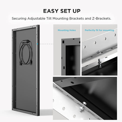 The panel's installation is quick and simple, with pre-drilled holes and a grounding hole for various configurations, making it ideal for off-grid applications such as RVs, rooftops, cabins, yachts, and more. The panel includes a 3.3ft solar cable, which makes installation more flexible and convenient.