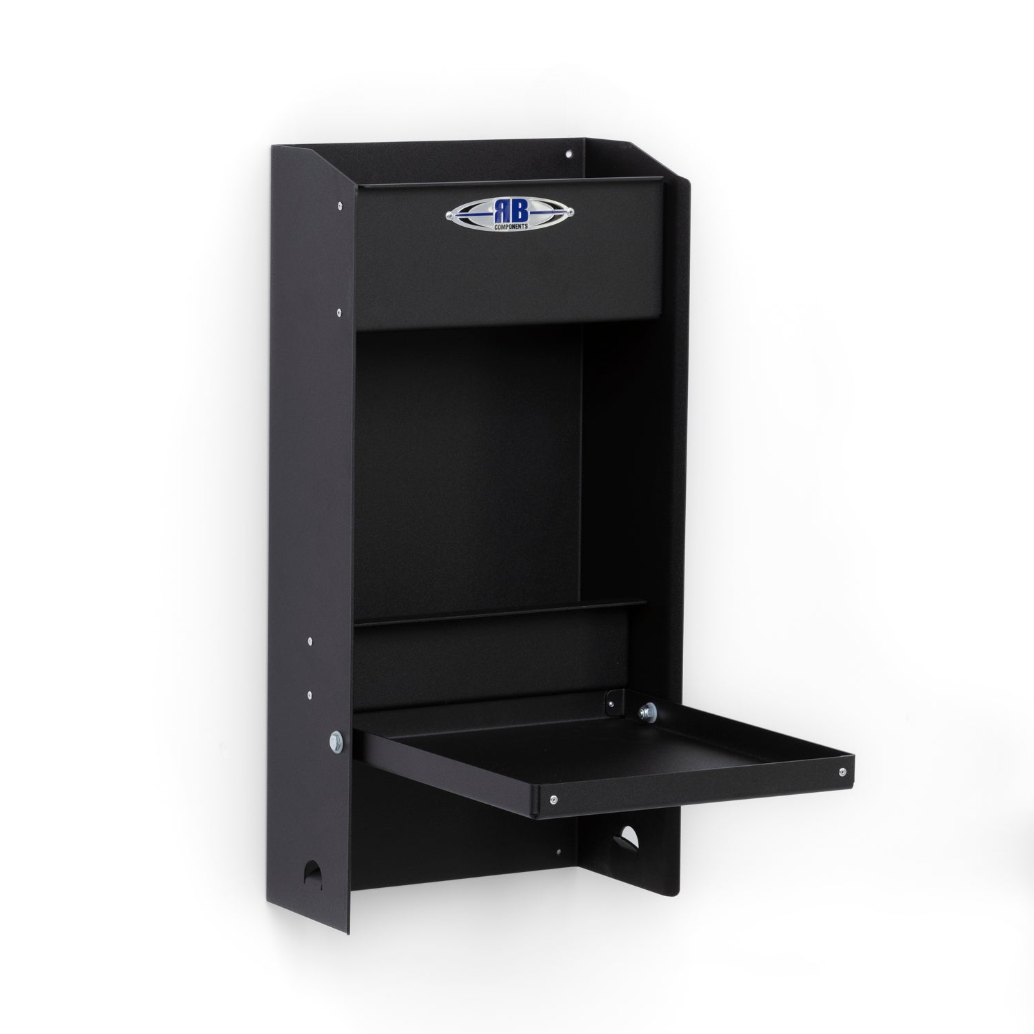 RB Components Jr. Folding Work Station is the perfect way to keep your most frequently used shop chemicals and cleaners right where you need them. This storage cabinet provides an upper shelf that will accept 4 quarts of oil and a lower shelf that can store 4 aerosol cans. Combine this with a 12-1/2-inch deep fold down table that rotates on nylon washers and you have a baby workhorse for those with 24" trailer doors or limited space to mount it. Chemicals and stored products are shown in pictures for reference only and are not included with this item. Made from durable powder-coated aluminum, this product will stand up to years of abuse. Proudly Made in the U.S.A.