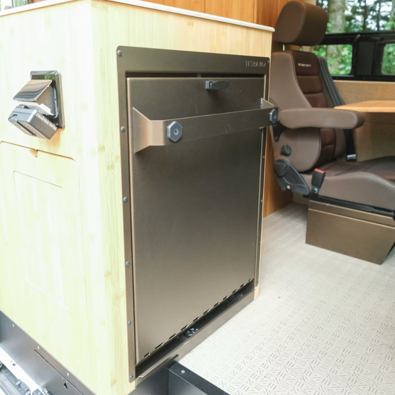 The Tetravan Folding Shower is designed for maximum convenience. Simply fold down the integrated shower pan, connect the included magnetic shower curtain, and your private shower is ready in less than a minute. Once you’re finished, the shower folds neatly back into place, keeping your van interior clean and uncluttered.